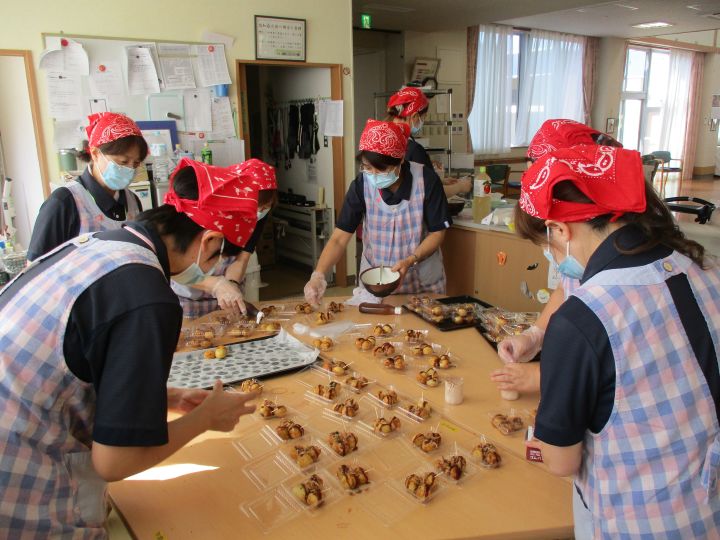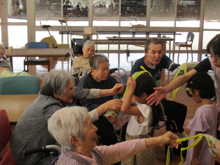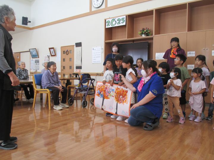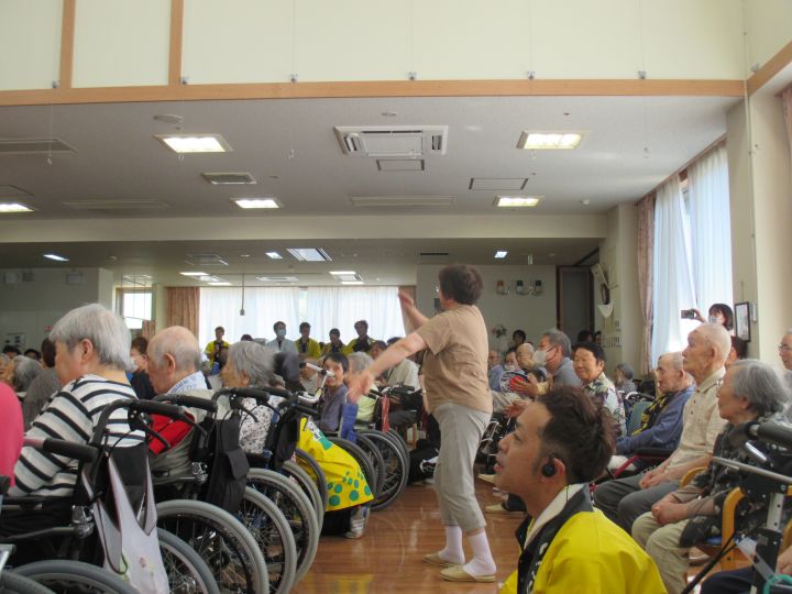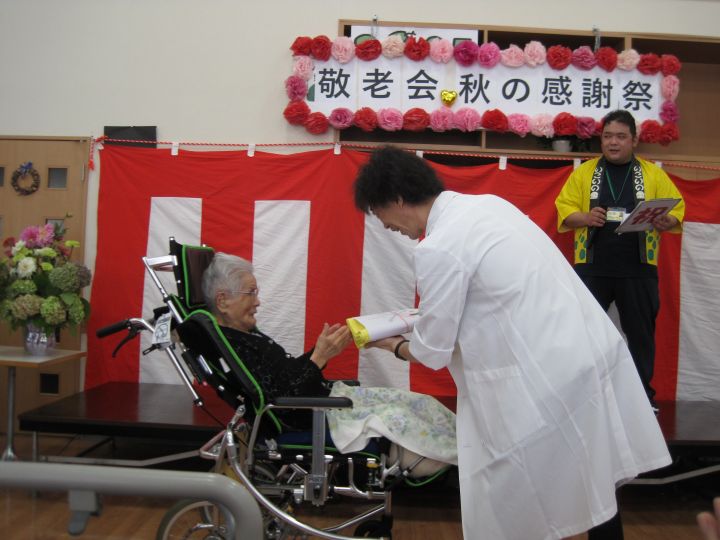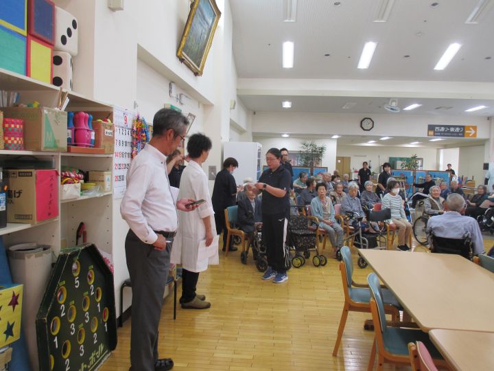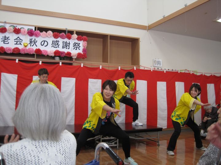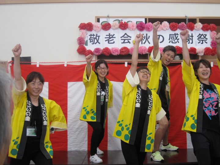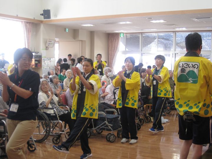 9月に行われた行事をご紹介します。 2025-10-06 最終更新日時 : 2025-10-06 医療法人翠峰会 いこいの里 毎年恒例の夏祭りは、今年から日程を変更して、9月6日に室内で開催しました。また名称を「敬老会・秋の感謝祭」と改めました。 ご利用者様全員に記念品としてバスタオルをプレゼントしました。 慰問では、『明扇流華の会』様から踊りを披露していだきました。 色鮮やかな着物をまとい、優雅な舞を披露して頂きました。 タイから鹿角へ嫁いだ方ですが、故郷の踊りを披露して頂きました。特に手の動きが素晴らしかったです。 職員からは『チーム南中ソーラン』を披露して頂きました。 ご利用者も一緒に『どっこいしょ!どっこいしょ』と掛け声をかけていただきました。 恒例の八幡平音頭です。 ご家族や地域の皆様からも一緒に踊って頂きました。 昼食の時間に合わせ、露店がスタートしました! 沢山のご馳走を用意しましたよ! 食事場所として用意したテント内は、あっという間に満席になりました。 天気良く、皆さん、美味しいものを召し上がりながら、一家団欒な時間を過ごされました。 9月26日になかよしセンターの園児の皆さんが、元気いっぱいの笑顔を届けてくれました。 園児に皆さんが心を込めて作ってくれた、素敵な記念品を頂戴しました。 とっても可愛いですね。さっそく施設内に展示させて頂きました。 お返しに、ご利用者の皆さまから、お菓子をプレゼントしました。 9月24日に防災訓練を行いました。消化器訓練① 消化器訓練② 火災避難訓練(通所リハビリ)① 火災避難訓練(通所リハビリ)② 火災避難訓練(通所リハビリ)③ 火災避難訓練(入所夜間想定)① 火災避難訓練(入所夜間想定)② 火災避難訓練(入所夜間想定)③ 火災避難訓練(入所夜間想定)④ 火災避難訓練(入所夜間想定)⑤ 火災避難訓練(入所夜間想定)⑥ 火災避難訓練(入所夜間想定)⑦ 火災避難訓練(入所夜間想定)⑧